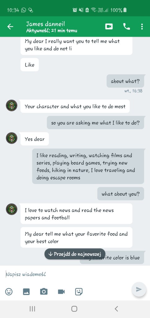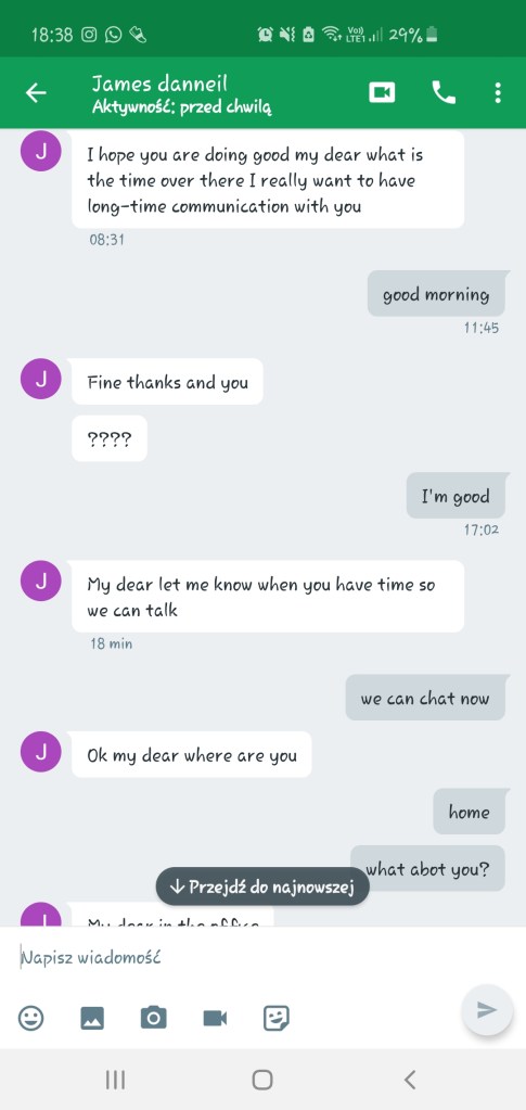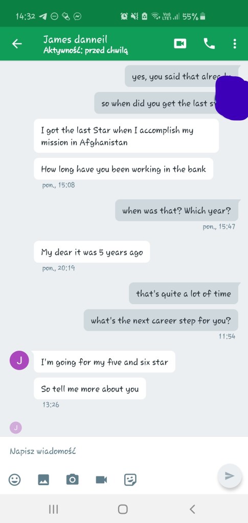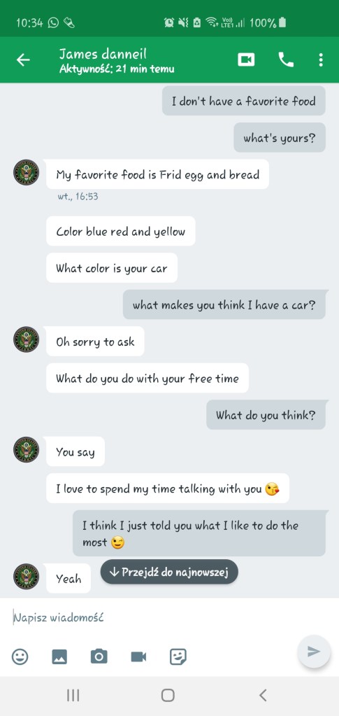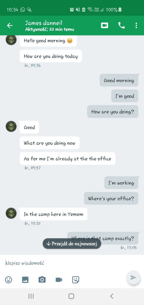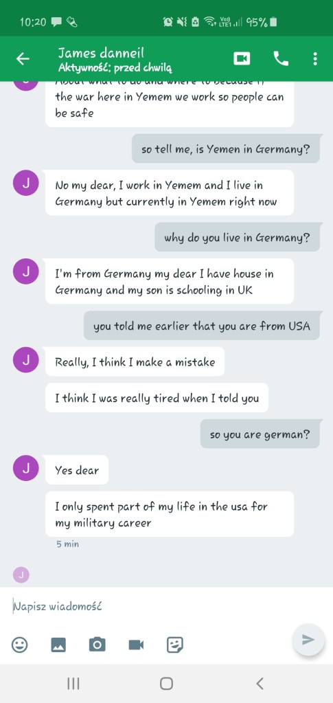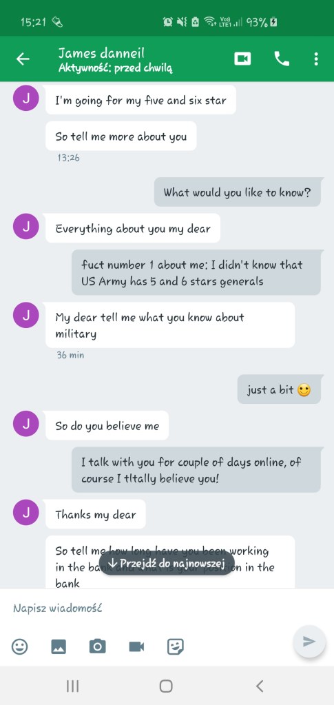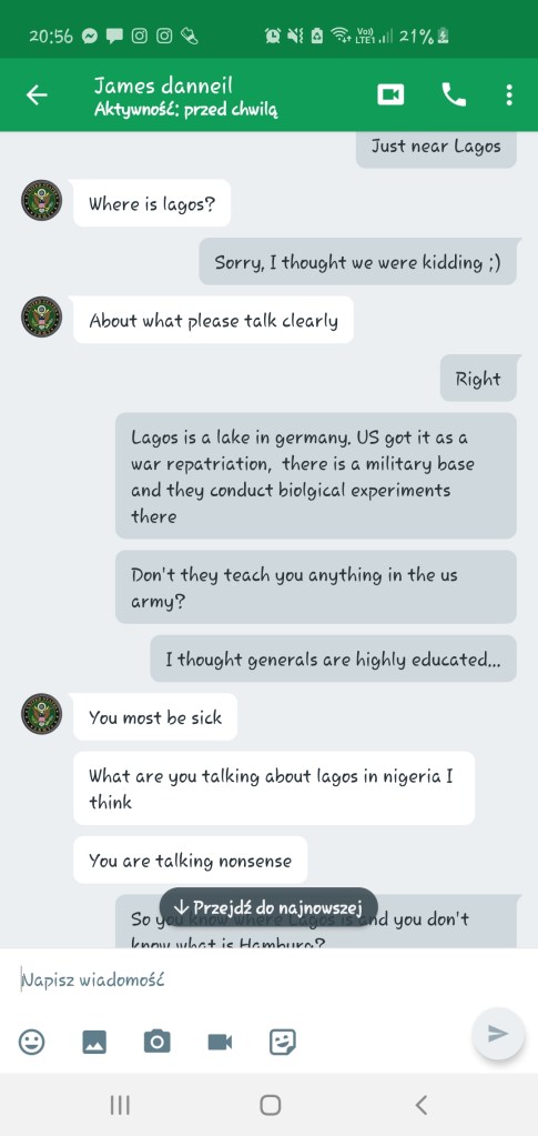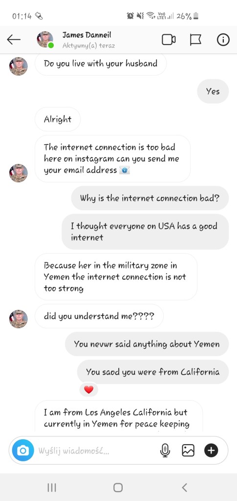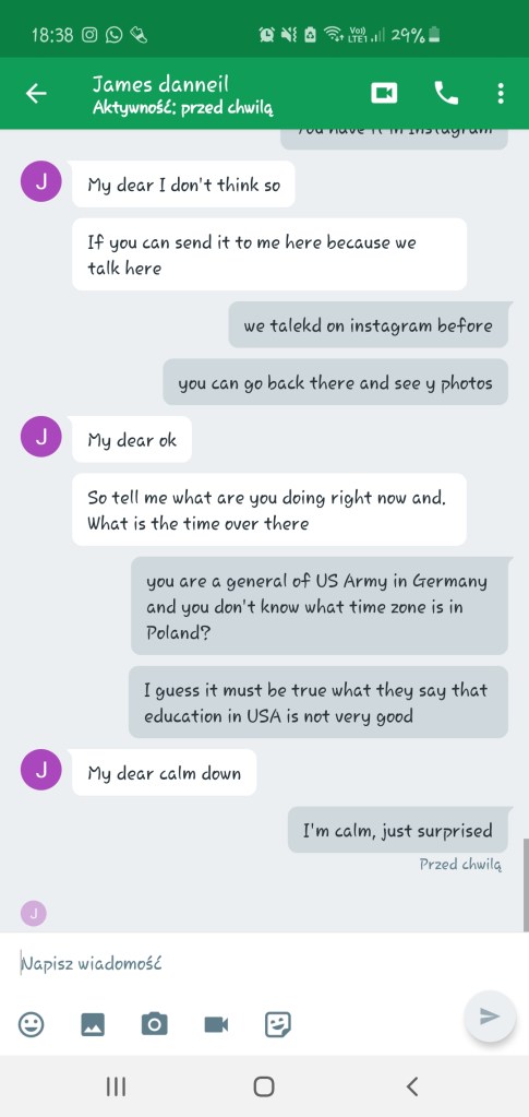 Szybko załatwiliśmy wstępną gadkę-szmatkę i przeszliśmy do pierwszego punktu z Checklisty Scamu Na Amerykańskiego Żołnierza, czyli do przeniesienia na inną platformę komunikacji. Najwyraźniej słusznie przewidywał, że zablokują mu konto: dwa ostatnie screeny dorobiłam dla Was niedawno, jak widać konto już nie istnieje. Zastanawiam się, czemu amerykańskim żołnierzom tak blokują te konta, podczas, gdy cała masa innych oszustów ma swoje całymi miesiącami. Może dlatego, że kradną cudze zdjęcia? Jak myślicie?