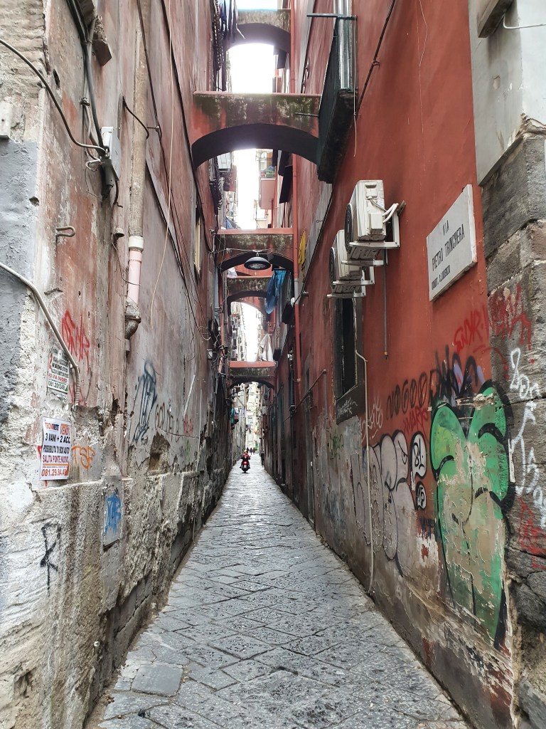 Począwszy od tego, że samo centrum – Spaccanapoli – czyli część, która zazwyczaj jest najładniejsza w starych miastach, w Neapolu jest chyba najbardziej obskurna i odrapana. Wąziutkie uliczki, które mogłyby być super urokliwe są zaśmiecone, kamieniczki odrapane, łuszczące się, poodpryskiwane i pomazane graffiti.