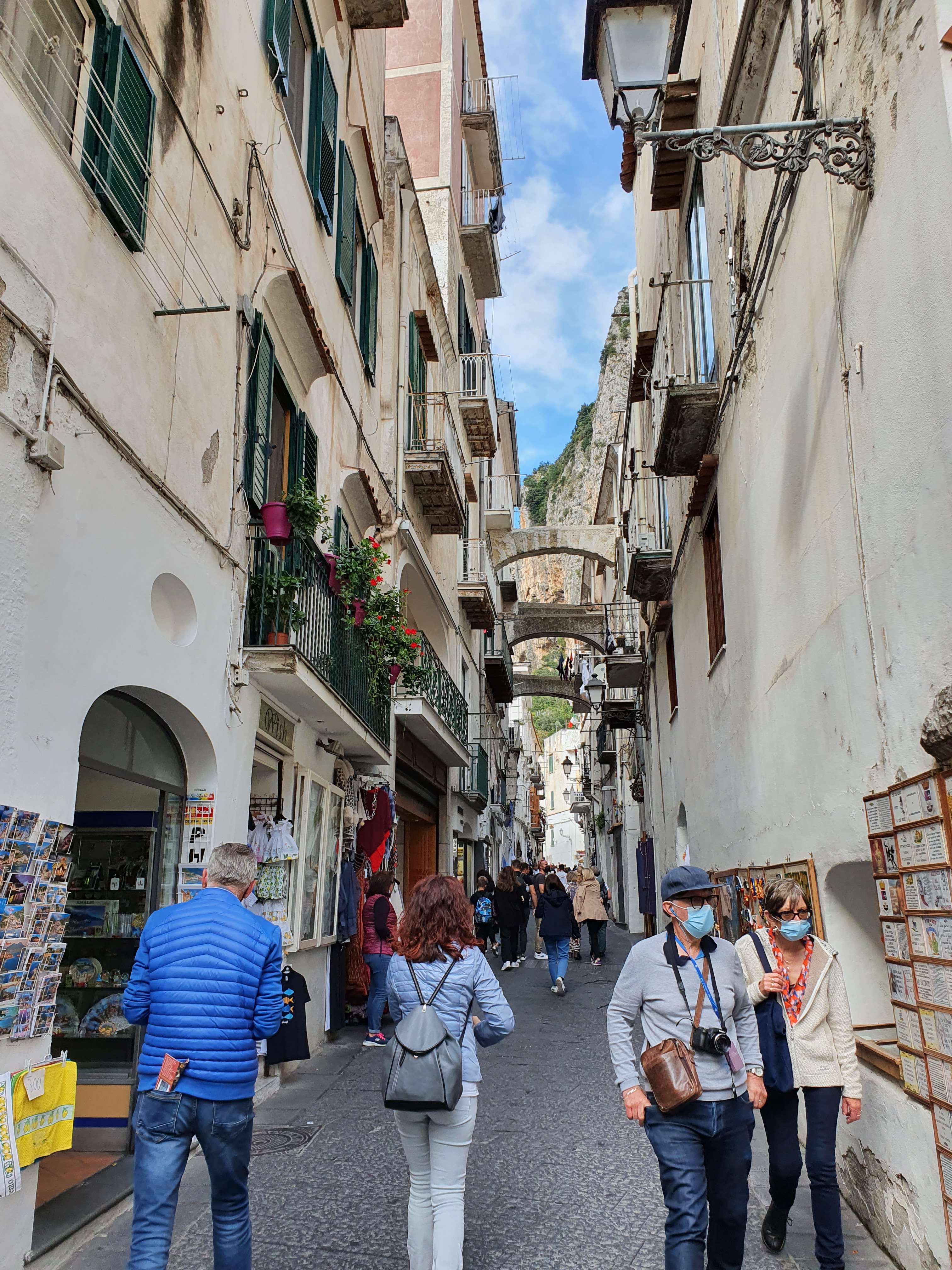 Naszym następnym przystankiem było Amalfi, które mimo bliskości klifów, jest położone w znacznie większej części na poziomie morza. Do tego główna droga biegnie przez sam środek, więc nie sposób się tu zgubić. Samo miasteczko jest małe i urokliwe, a część interesująca turystów składa się właściwie z promenady wzdłuż brzegu oraz w sumie jednej ulicy biegnącej w głąb lądu wypełnianej restauracjami, lodziarniami i sklepikami. Jest też też kościół z bardzo okazałymi schodami i fasadą.