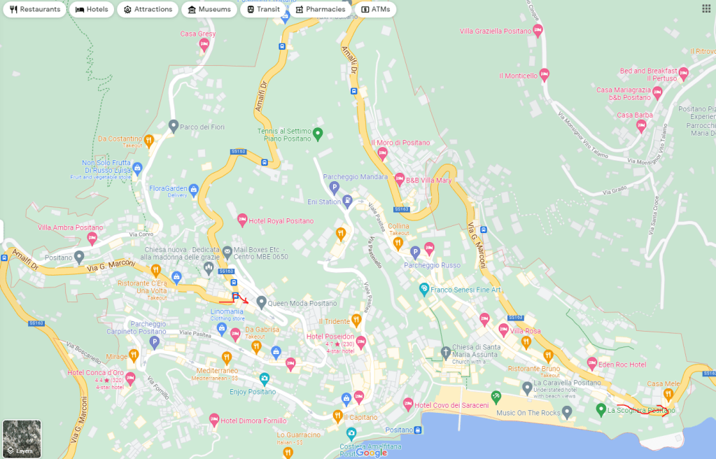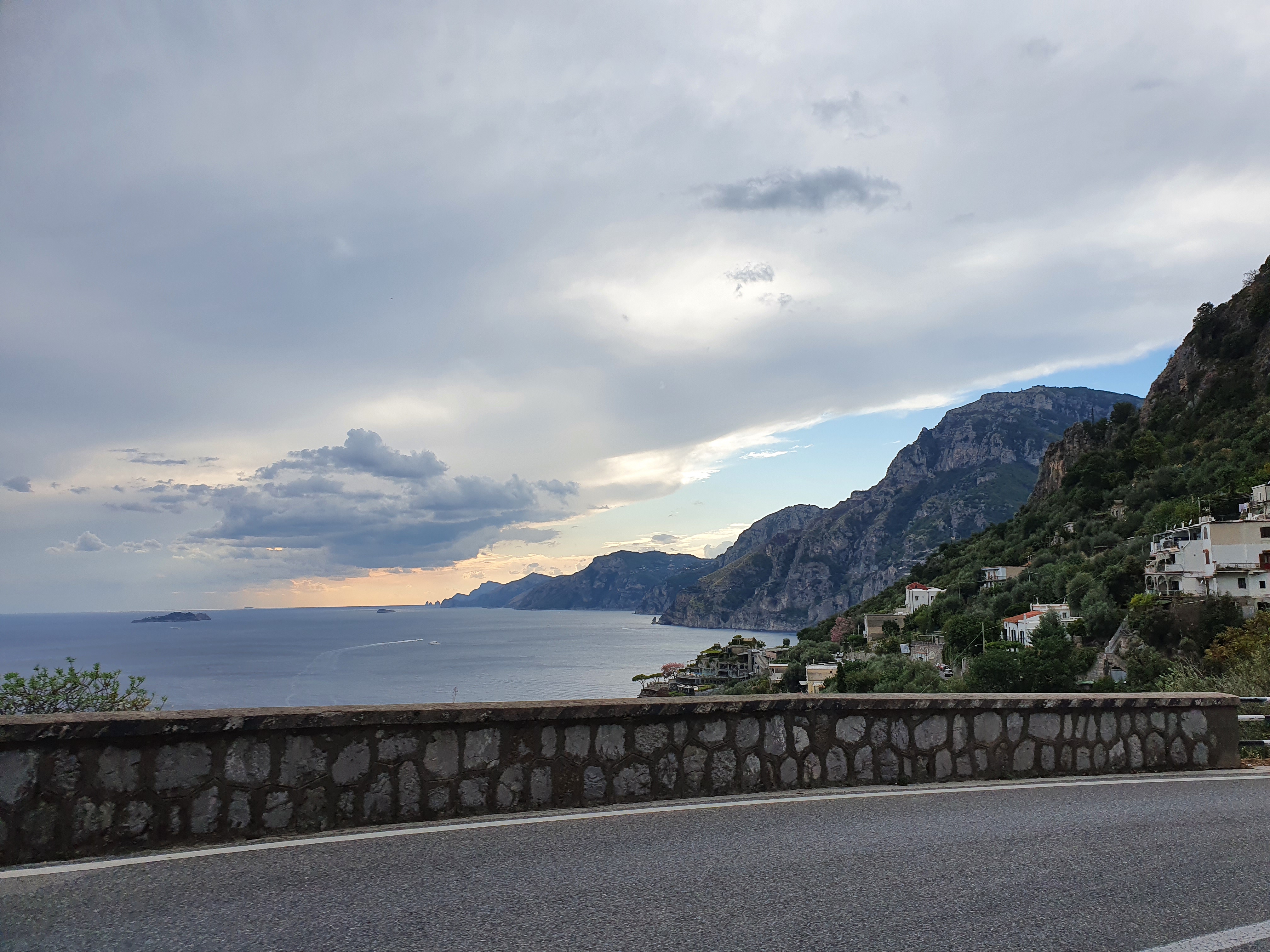 Na naszą skuteriadę mieliśmy dwa dni, więc zaczęliśmy na spokojnie Już pierwszego dnia okazało się, że pech pogodowy nas nie opuszcza: było pochmurno i zimno. Ale kto by się tym przejmował! Najpierw pojechaliśmy do Positano. Positano – tak samo jak Sorrento – leży na klifie. I to wysokim. Do tego znajduje się w głęboko wciętej w ląd zatoczce, dlatego całe miasto w sumie ma kształt )w uproszczeniu) litery U. To co jest w nim ciekawe to to, że w zasadzie ma dwie ulice (dostępne dla ruchu kołowego). Jedna jest dwukierunkową „obwodnicą” i otacza miasteczko od góry wzdłuż litery „U”. Od niej w pewnym momencie odbija w prawo (przyjmując kierunek jazdy od Sorrento do Amalfi) druga ulica, tym razem jednokierunkowa, która wije się w dół, powiedzmy że w poprzek naszego U, żeby w końcu podjechać znowu do góry i połączyć się z „obwodnicą” po drugiej stronie. Cała reszta to uliczki piesze, przesmyki i bardzo duża ilość schodów. Jak mówiłam klif jest wysoki, więc jeśli chcecie dotrzeć do centrum, macie tylko jedną szansę skręcić dobrze i zjechać w dół – bo raczej nie polecam parkowania przy „obwodnicy” i złażenia.