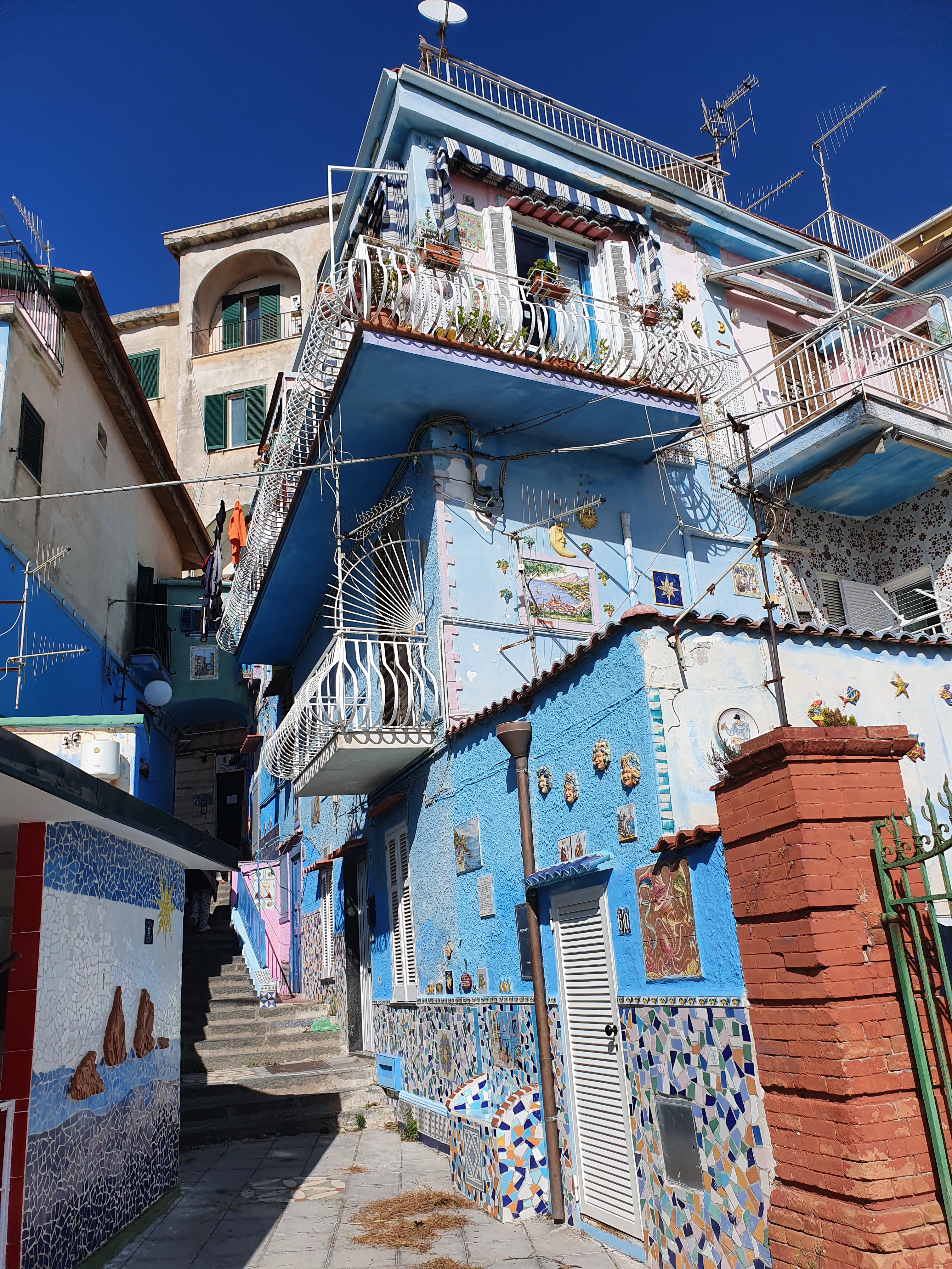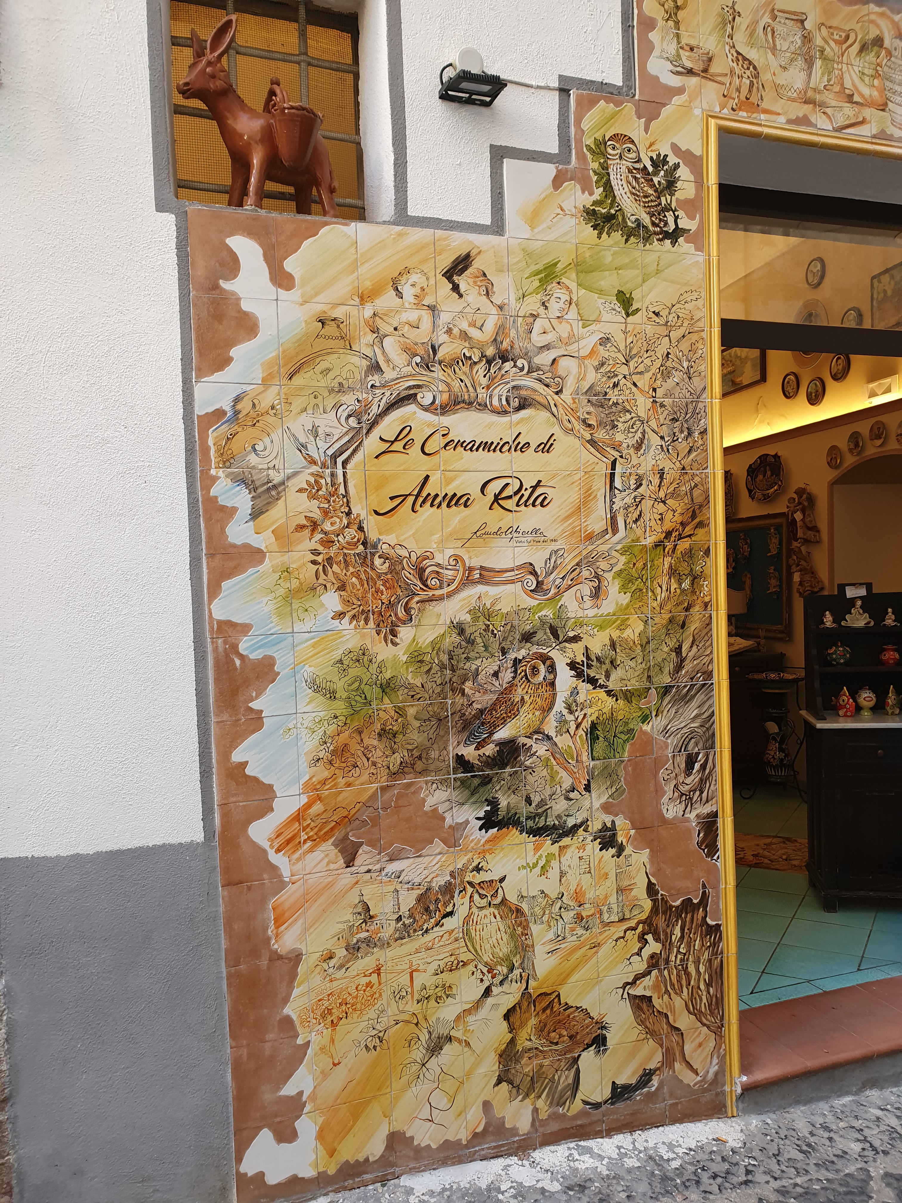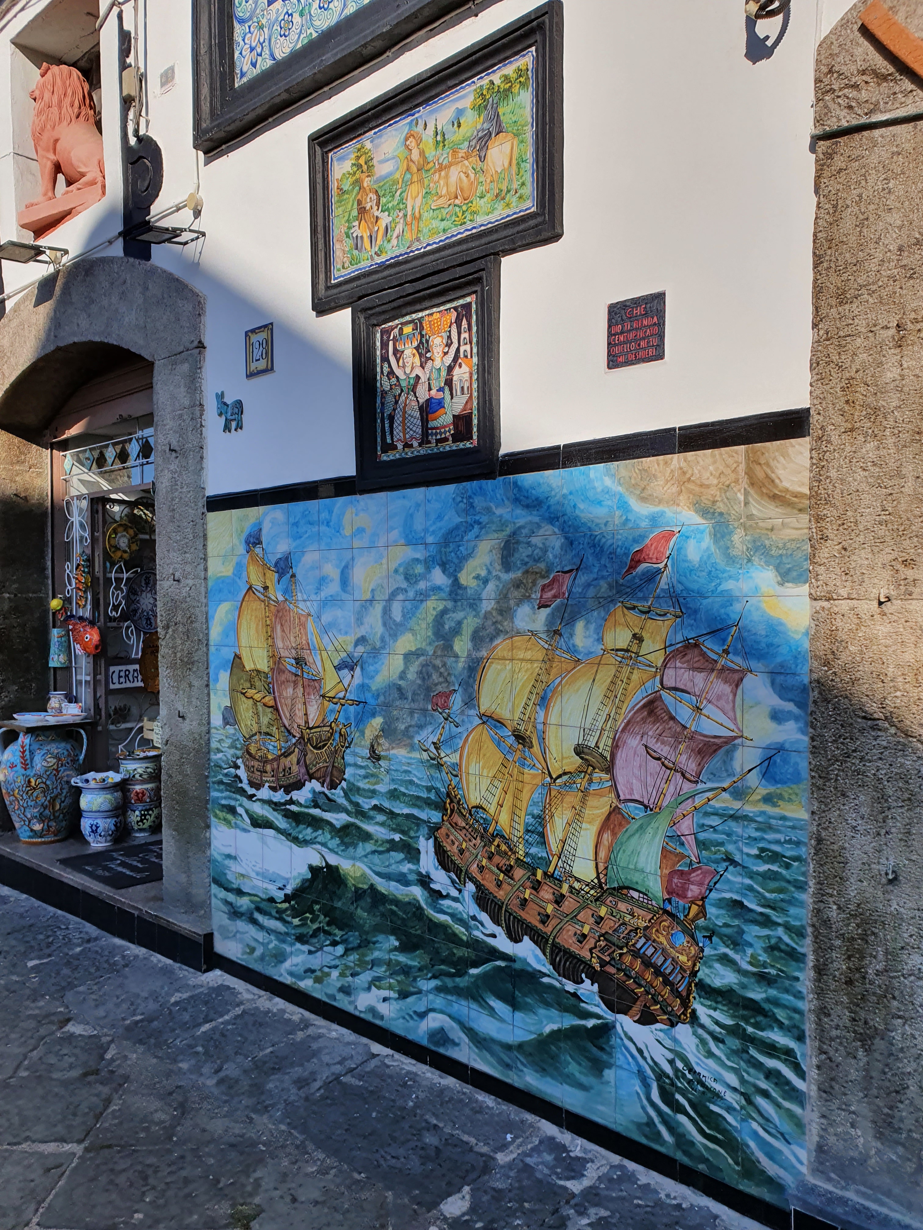Te dwa miasteczka plus oswajanie, się z jazdą i drogami zajęło nam większość dnia. Wróciliśmy zmęczeni, zmarznięci, ale zachwyceni, a już kolejnego poranka wyruszyliśmy znowu w trasę, tym razem mając w planie pojechać znacznie dalej – a konkretnie na sam „koniec” Amalfi Coast. Znaleźliśmy tam prawdziwą perełkę, czyli miasteczko Vietri Sul Mare, które nie dość, że okazało się przeurocze i niezwykle ciekawe, to jeszcze znacznie mniej popularne wśród turystów. Vietri także jest wielopoziomowe: „na dole” jest plaża i marina, które były kompletnie wyludnione (niewykluczone, że miało to związek z tym, że dzień był potwornie wietrzny), a „na górze” jest urocza starówka. Miasteczko specjalizuje się w produkcji ceramiki, bo niemal każdy budynek był ozdobiony mozaikami i kafelkami, podobnie jak różne schody, przejścia i nawet murki wzdłuż ulicy!
