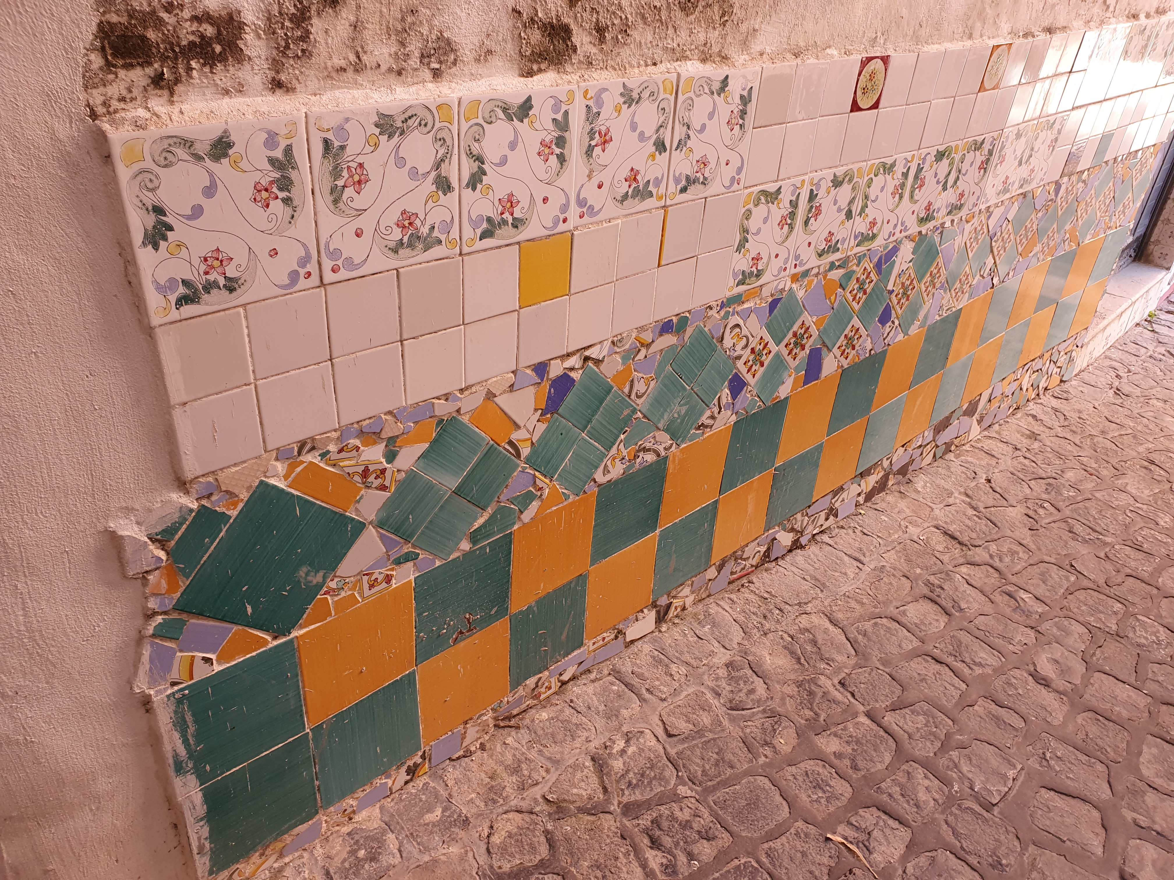 A tu mozaiki zdobiące budynki, sklepu, murki i przejścia: